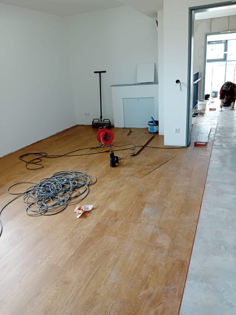 Ein weiterer großer Schritt folgte Ende März, als der Bodenbelag fachmännisch verlegt wurde und die Halle damit immer mehr ihren finalen Charakter erhält.