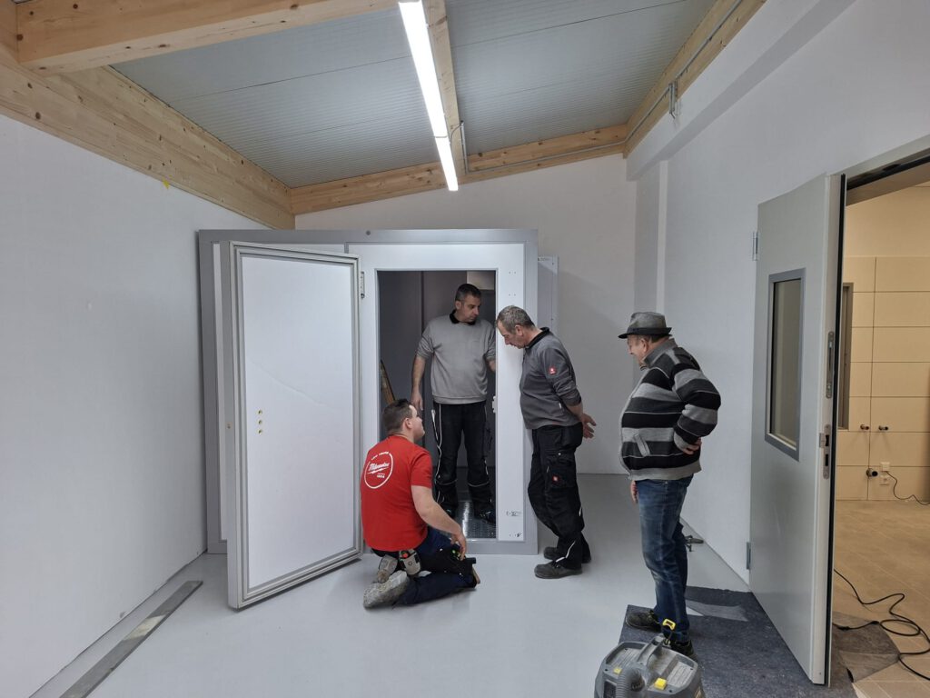 Auch im Innenbereich wurde kräftig angepackt: Die Küchenausstattung sowie die Kühlzelle konnten in Eigenleistung aufgebaut werden – ein weiterer wichtiger Beitrag für den späteren Betrieb der Halle.